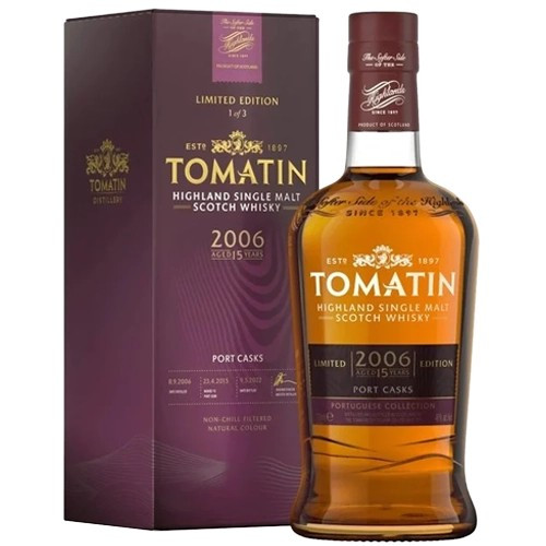Tomatin 15 years 2006 Port rijpt 8 jaar in ex-bourbonvaten om daarna, als onderdeel van de Portuguese Collection 7 jaar verder te rijpen in ex-portvaten. Deze single malt whisky heeft een rijk karakter waarin diverse fruitsoorten elkaar ondersteunen; bosbessen, frambozen, kersen, abrikozen en perzik.